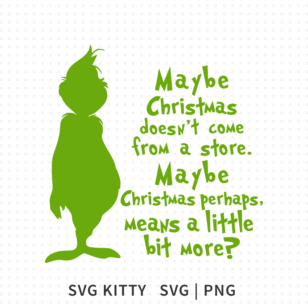 This Maybe Christmas Means A Little Bit More SVG combines a bold Grinch silhouette with the well-known quote in a clear, easy-to-cut layout. The text is arranged for smooth cutting and weeding, and the silhouette keeps details simple enough for shirts, signs, ornaments, and print-and-cut crafts. The design maintains the charm of the original line while giving you a clean graphic that works well at both small and large sizes, making it a reliable holiday SVG for your seasonal projects.